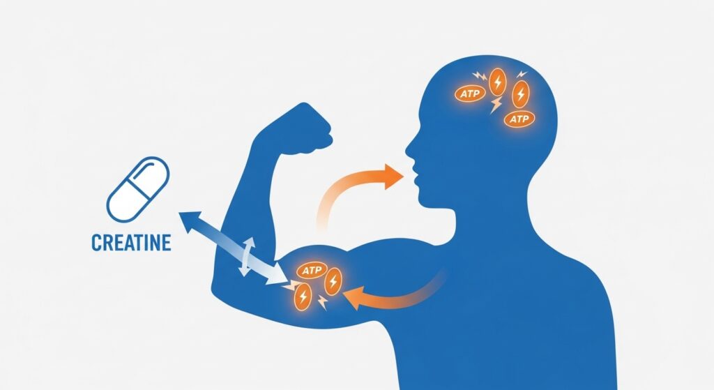クレアチンは筋肉内のエネルギー供給を改善する補助食品として知られているが、近年では脳内のエネルギー代謝を支える可能性も注目されており、特に認知負荷が高い状況での運動パフォーマンス改善が期待されている。